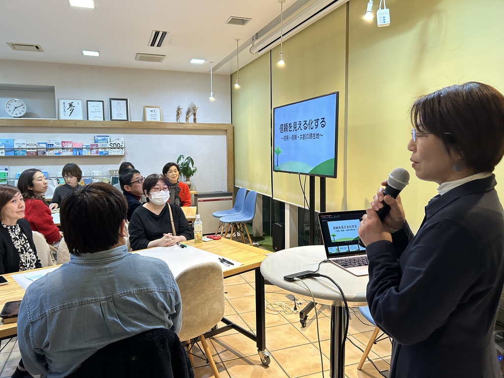 続いて、株式会社オフィスatの寺島さんの進行により、メインコンテンツであるワークショップがスタートしました!今回のテーマは「信頼の見える化」です。寺島さんは、信用・信頼・共創の3段階を「木」の成長になぞらえて解説しました。