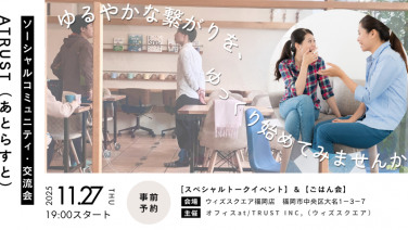 11/27(木)に、新しいイベント、atrust(あとらすと)を開催しました。コワーキングスペースの会員さんと共同で開催したイベントです。。イベントは、真剣なお話しから、その後の交流会では、和気あいあいとした雰囲気でお届けました。当日の模様を簡単にまとめましたので、ぜひごご覧ください。